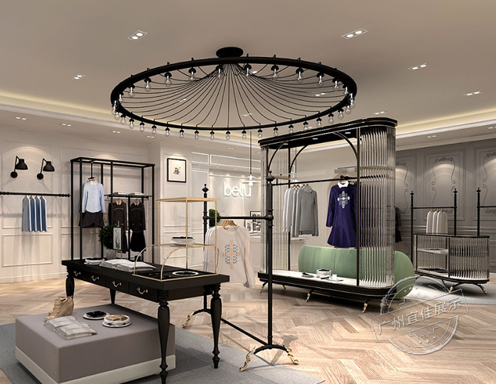 此店的玻璃服装展柜主要材质为玻璃和金属。玻璃服装展柜的顶部、底部、支架等结构部位采用不锈钢材质,而侧面和前面则采用钢化超白玻璃材质。整店采用简约、时尚的设计风格,以突出展示服装的效果。内部配备有灯光、展示架、吊杆等展示配件,以便于展示服装的效果更加突出。