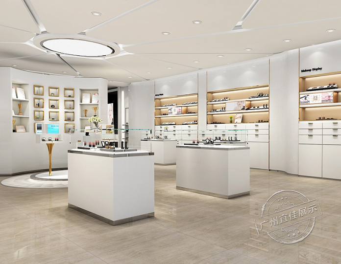 DERIK 化妆品玻璃展柜设计方案为商场店形式,柜台均采用纯木质白色亮光烤漆,纯白色LED灯,及透明钢化玻璃相结合,彰显化妆品的档次,化妆品中岛制作[宜佳展示]采用木质烤漆和不锈钢制作,全面提升视觉效果,凸显品位高端质感。