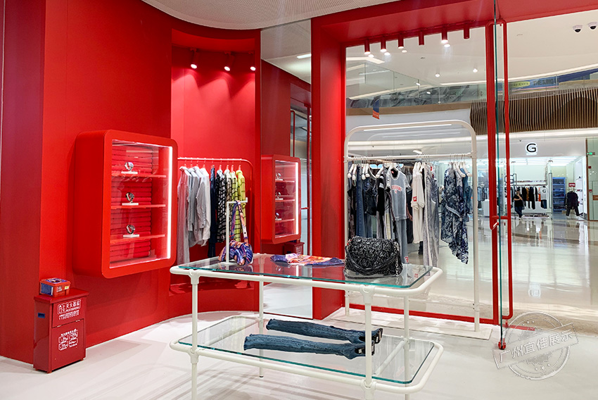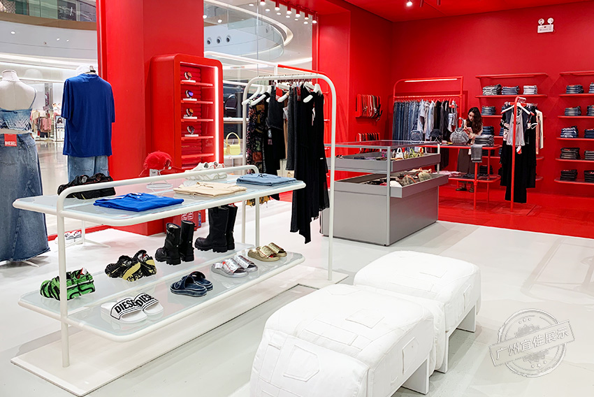 DIESEL(丹宁)店铺外立面以品牌经典的醒目红色和标志性红白LOGO装点,店内设计上,大胆开辟纯净红色空间,覆以红色漆面的墙壁环绕四周,极具视觉冲击力,体现了品牌全新的设计理念和前卫态度。服装展柜以品牌经典红、白、金属柜组成,个性创新的设计布局将时尚与科技感融合,打造富有品牌形象的交互空间。