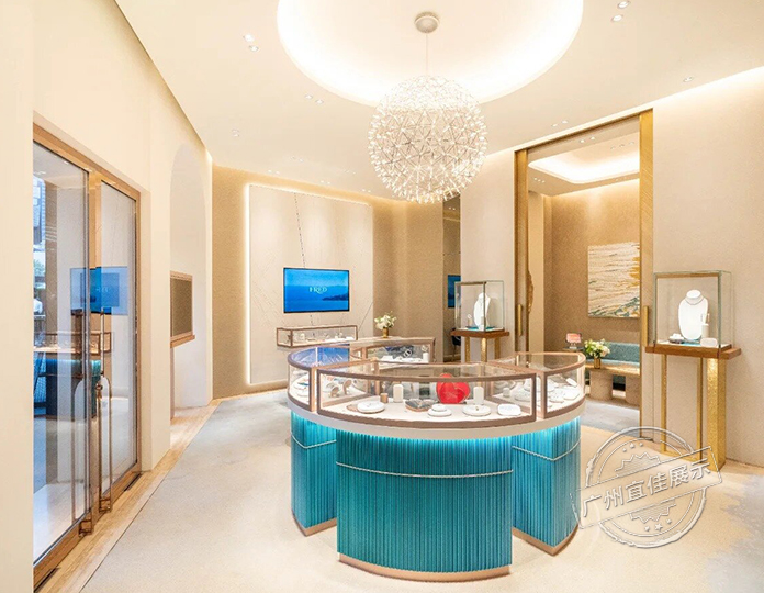 Fred斐登珠宝展柜定制包括岛柜和壁柜,通过精致的设计和合理的布局,展现珠宝的魅力,为顾客营造奢华舒适的观赏空间。岛柜以弧形为主,可以从多个角度展示珠宝,吸引顾客的注意力。壁柜通过分层和分隔,将不同类型的珠宝有序地展示,从而高效利用墙面空间。部分室内还设有单独的小展示区,用于展示重点款式或新品。定制珠宝展示柜主要以米色、蓝绿色和金色为主色调。米色和浅木色营造出温馨典雅的氛围,而蓝绿色作为品牌的标志性颜色,应用于展柜底部和部分墙面区域,为空间增添独特的视觉效果。展柜框架和装饰线条采用金色,增强奢华感。