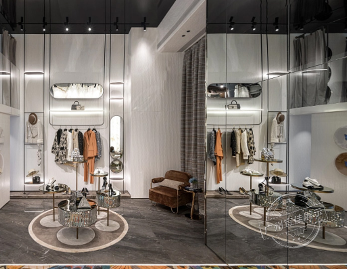 此店的服装精品店展柜具有时尚现代的外观设计,采用高质量材料,如镜面不锈钢、拉丝不锈钢+钢化玻璃的组合,提供多功能陈列,包括衣架、陈列架和酒柜,配备适当的照明效果。整体空间规划合理,定制化设计以展示品牌标识和装饰元素。