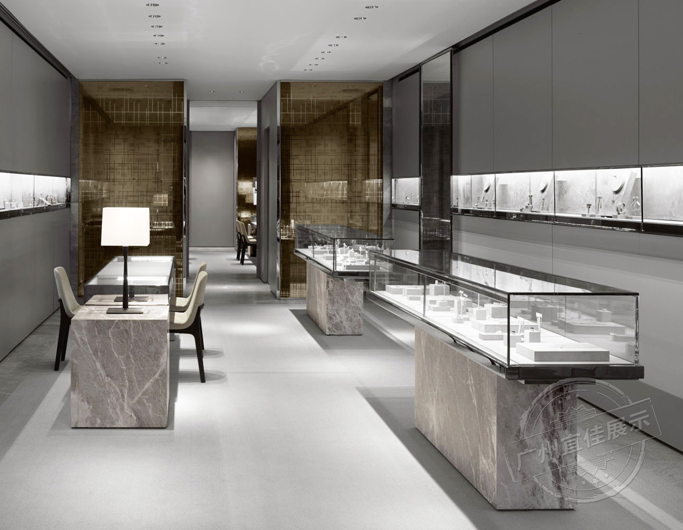 Mark-Lash 珠宝展柜主空间大量使用了青铜镜和双色玻璃,配合温润的背景天然石材及中性灰色幕墙板,整体氛围柔和细腻,庄重雅致。首饰的内嵌展柜,采用柜内隐藏式顶光作为主光源。其技术艺难度在于柜内空间较狭小,如何在较短的照程范围内,将光线均匀散布,产生柔和润泽的效果,同时不失陈列品细节上的层次。