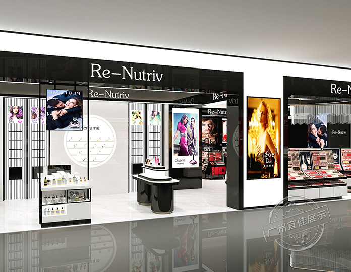 [宜佳展示]40000㎡实力厂家,在此店的化妆品展柜上,采用简单的黑白配色+YJPY漆面工艺,如钢琴版丝滑,配上通透的大理石地板,让人视感得以放松,同时显示出高端质感。