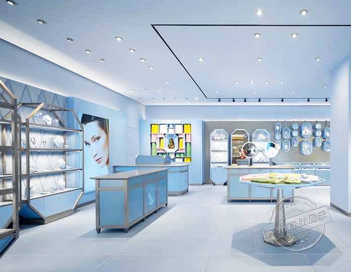 SWAROVSKI施华洛世奇珠宝展柜定做,设计与品牌定位精准契合,宜佳展示以浅蓝色为主色调,搭配独特的造型,融入众多几何元素,例如八角形展示柜,为空间增添立体感和设计感。圆形桌子等展示道具经过精心设计,将产品呈现得如同精心挑选的礼物,营造出梦幻般的氛围。强化了品牌在消费者心中时尚优雅的形象,提升了品牌的认知度和美誉度,同时吸引目标客群。